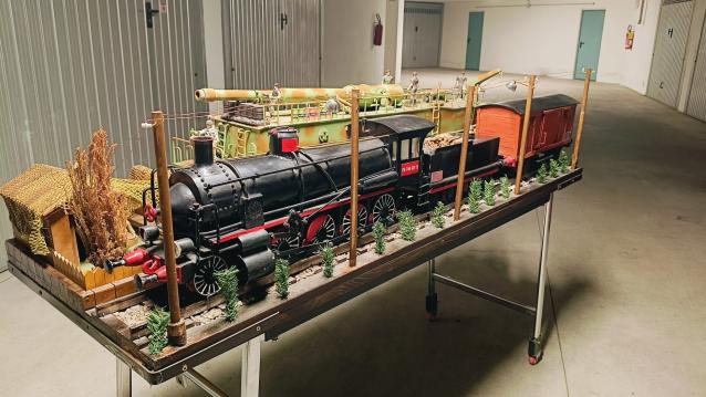 Vendo composizione, interamente realizzata a mano in 800 ore di lavoro, in acciaio, raffigurante: cannone Leopold Krupp montato su binari, affiancato da locomotiva FS746 GR13 con tandem portacarbone e vagone portaproiettili. Dimensioni ingombro: 187 x 60 cm. Altezza 35 cm. Prezzo trattabile dopo visione in loco. |