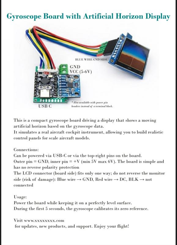 Orizzonte artificiale progettato e realizzato da appassionati di aeromodellismo per aeromodellisti. Si tratta di uno strumento compatto con giroscopio integrato che riproduce fedelmente l’orizzonte artificiale reale, ideale per: cockpit in scala modelli FPV progetti realistici Caratteristiche: ✔️ Prodotto ready to fly ✔️ Personalizzabile ✔️ Basta collegarlo alla ricevente (RX) ✔️ Alimentazione 5–6V ✔️ Calibrazione automatica all’accensione ✔️ Movimento fluido e realistico ✔️ Facile installazione Perfetto per chi vuole dare un tocco professionale e realistico al proprio modello. Prezzo: 75€ spedizione inclusa Per info o video del funzionamento contattatemi |